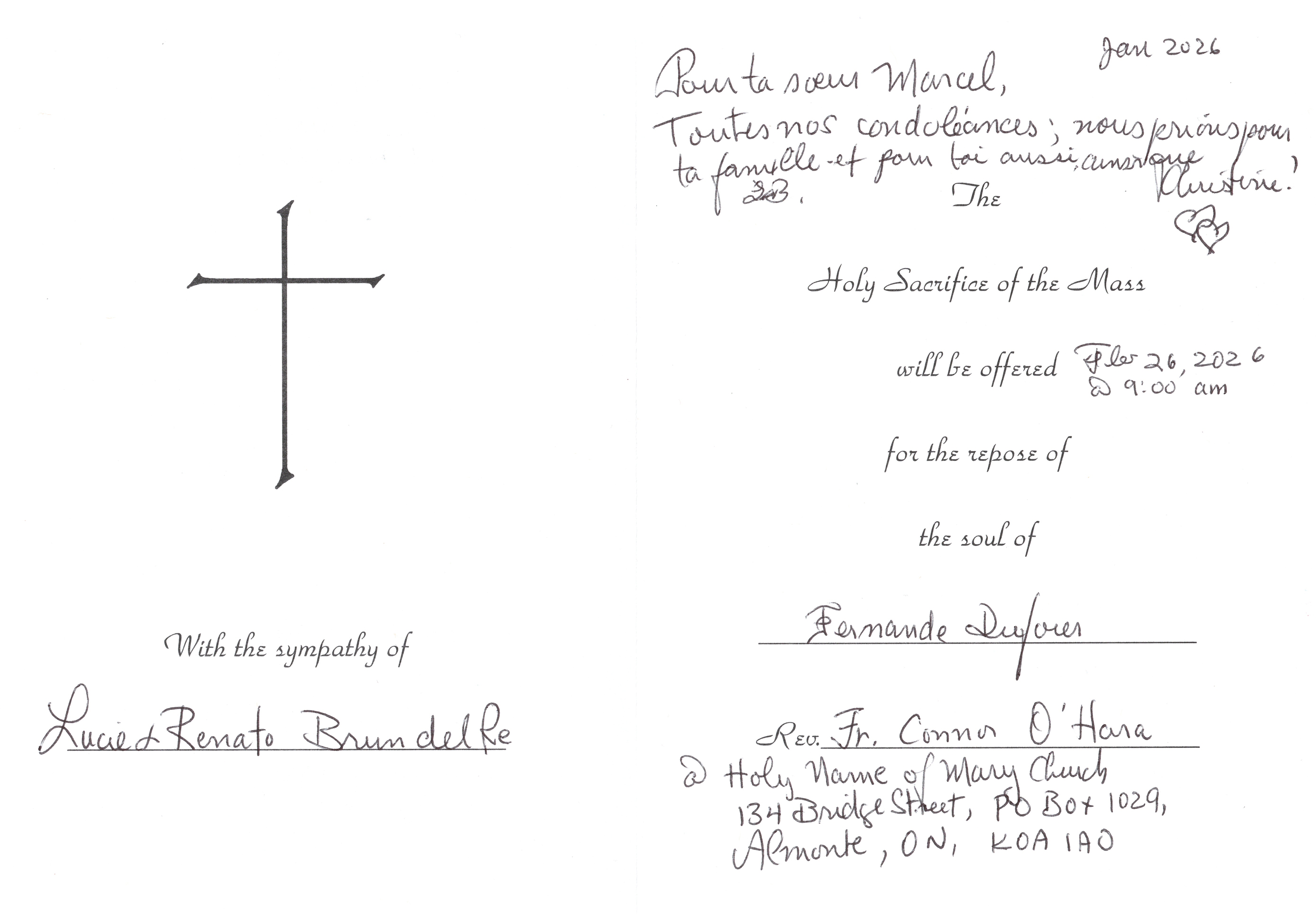 Une messe pour Fernande sera célébrée le 26 février, 2026 à 9h00 am. par le Père Connor O'Hara à "Holy Name of Mary Church" Ontario.
